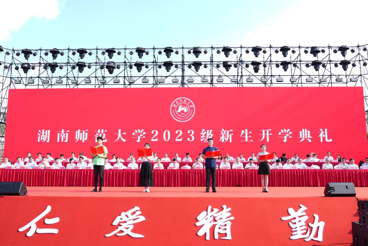 典礼第四项,由新生代表,法学院2023级博士研究生黄思瑞、文学院2023级硕士研究生杨柳、新闻与传媒学院2023级本科生陶冰蓝、物理与电子科学学院2023级本科生杨世琦发言。他们表明了对接下来学习生活的期待,并希望在未来的几年里做心向阳光,勇毅前行,不负青春,不负这个伟大时代的追梦人。